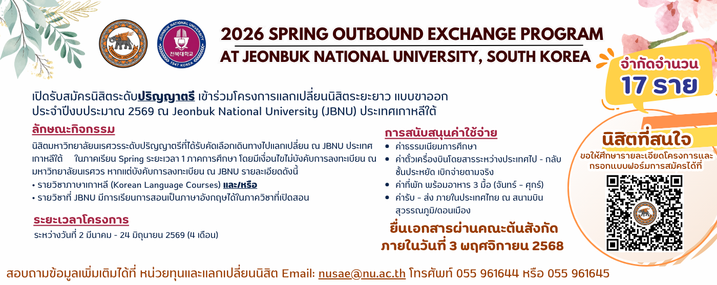 เว็บไซต์ มหาวิทยาลัยนเรศวร ใช้คุกกี้เพื่อเพิ่มประสิทธิภาพและประสบการณ์ที่ดีในการใช้เว็บไซต์ท่านสามารถศึกษารายละเอียดการใช้คุกกี้ได้ที่"นโยบายการใช้คุกกี้" และ นโยบายการคุ้มครองข้อมูลส่วนบุคคล
