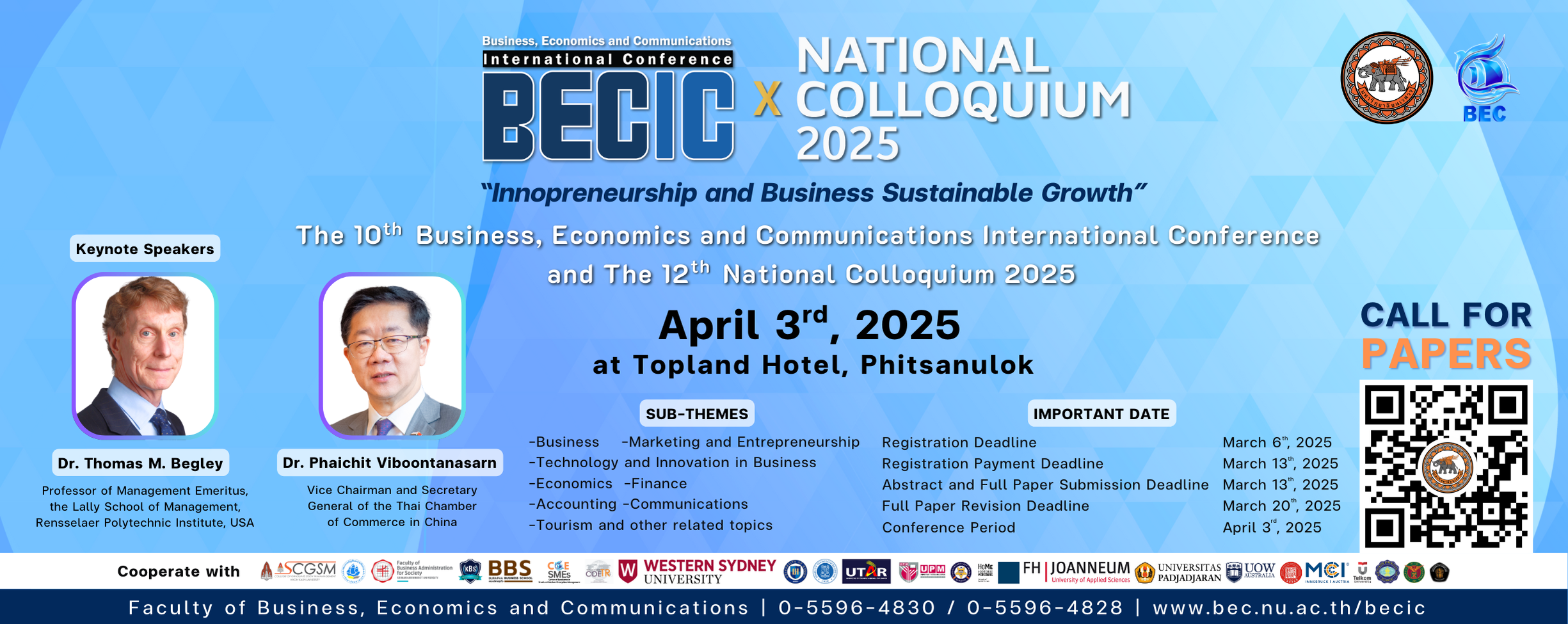 คณะบริหารธุรกิจ เศรษฐศาสตร์และการสื่อสาร ขอเชิญส่งผลงานและเข้าร่วมโครงการประชุมวิชาการระดับนานาชาติ ครั้งที่ 10 ประจำปี พ.ศ. 2568 และโครงการนำเสนอผลงานทางวิชาการระดับชาติ ครั้งที่ 12 ประจำ พ.ศ. 2568