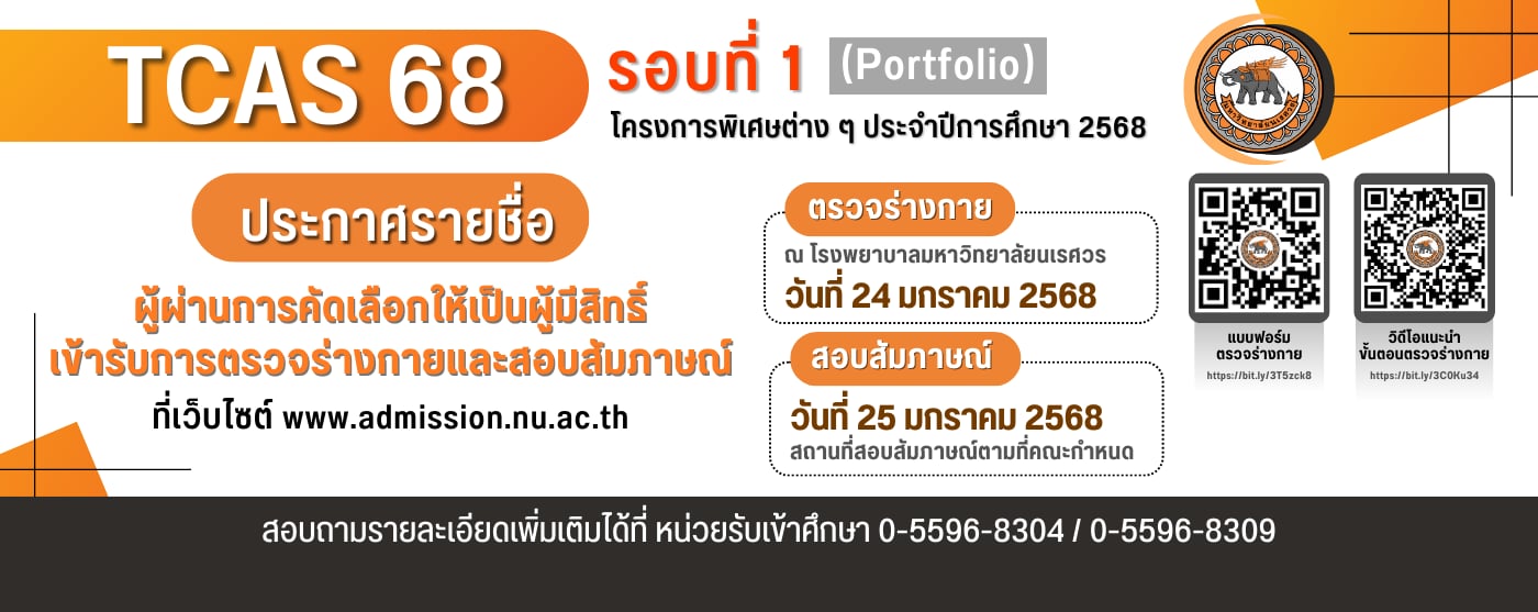 ประกาศรายชื่อ ผู้ผ่านการคัดเลือกให้เป็นผู้มีสิทธิ์ เข้ารับการตรวจร่างกายและสอบสัมภาษณ์ รอบที่ 1 (Portfolio) โครงการพิเศษต่าง ๆ ประจำปีการศึกษา 2568